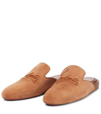 The Navy Coolito Donna slippers from Christian Louboutin's exclusive Nudes range are a lounge staple. This brown pair is made from soft suede with lambskin linings and logo-embroidered vamps. Product Details - Lining: leather - exclusive to mytheresa.com - Toe shape: round toe - Upper: lamb leather, calf leather - Sole: leather insole, signature red leather sole - Made in Italy - Item number: P00606988 Size & Fit - Fits slightly large to size - we recommend trying a half size smaller - European sizes - 3cm-1" wedge heel (size EU 38)