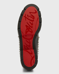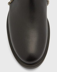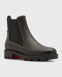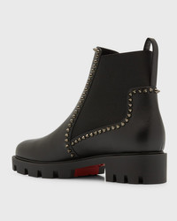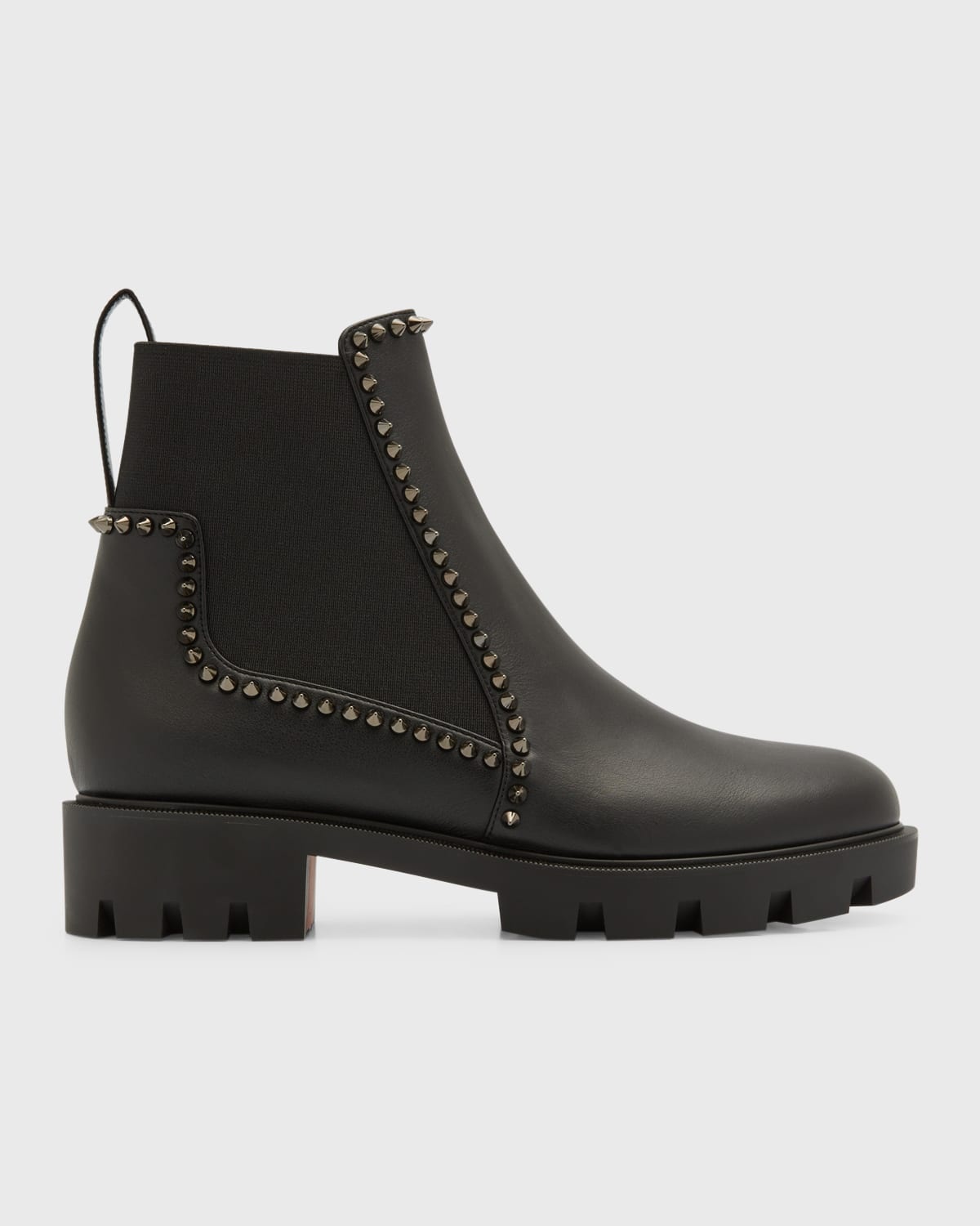 - Christian Louboutin "Out Lina" Chelsea ankle boots in smooth calf leather with signature metallic spikes - 2" stacked heel; 1" platform heel - Round toe - Asymmetric gored sides - Pull-on style - Pull-tab at back collar - Calf leather lining/insole - Signature Louboutin red rubber sole - Made in Italy - Sizing Note: true tor size; European sizing.