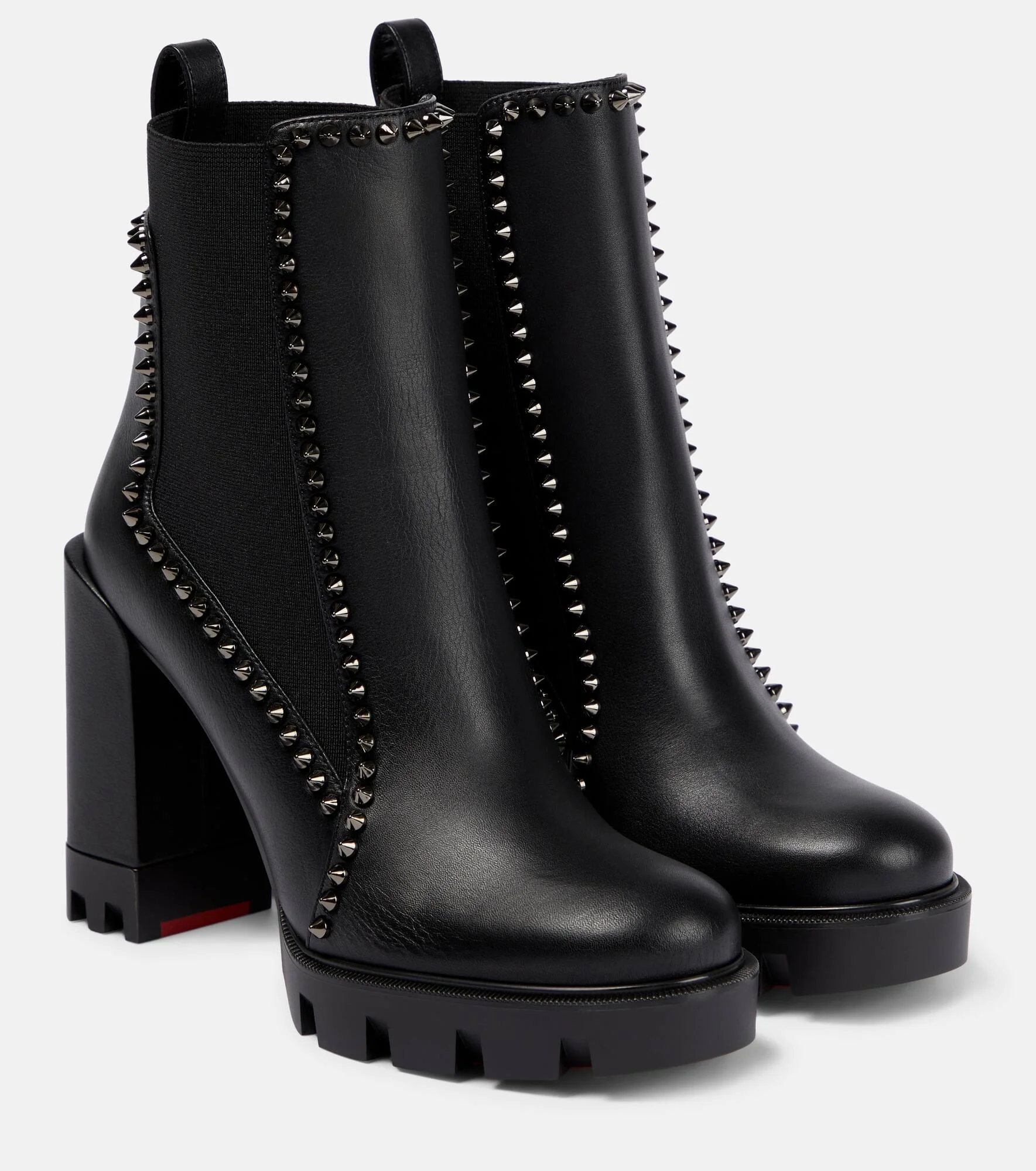 The Out Line Spikes Lug boot by Maison Christian Louboutin features an elegant upper with a curved toe set on a chunky easy-to-wear 70 mm rubber lug sole. This slip-on boot has elasticated side panels and a heel tab. The various sections are outlined with a row of evenly spaced signature spikes. This model is crafted in soft black calf leather. Product information Material: Calf leather Color: Black Reference: 1240561BK01 Heel height: 70 mm Collection: Summer 24