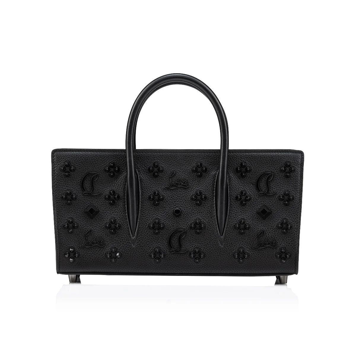 An iconic Maison Christian Louboutin model, the Paloma S handbag boasts a sophisticated appeal. Its elongated shape is crafted in black textured calf leather. It is adorned with signature tonal Loubinthesky spikes. - 2 handles and a shoulder strap allow it to be carried multiple ways - Zipped compartment - 1 interior zipped pocket - Dimensions: H 14 x L 28 x W 10 cm/H 5.5 x L 11 x W 4 inches Product information Material: Calf leather Color: Black Reference: 1245005CM53 Dimensions: 5.5 x 11 x 3.9 inches Collection: Summer 24