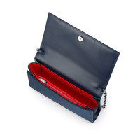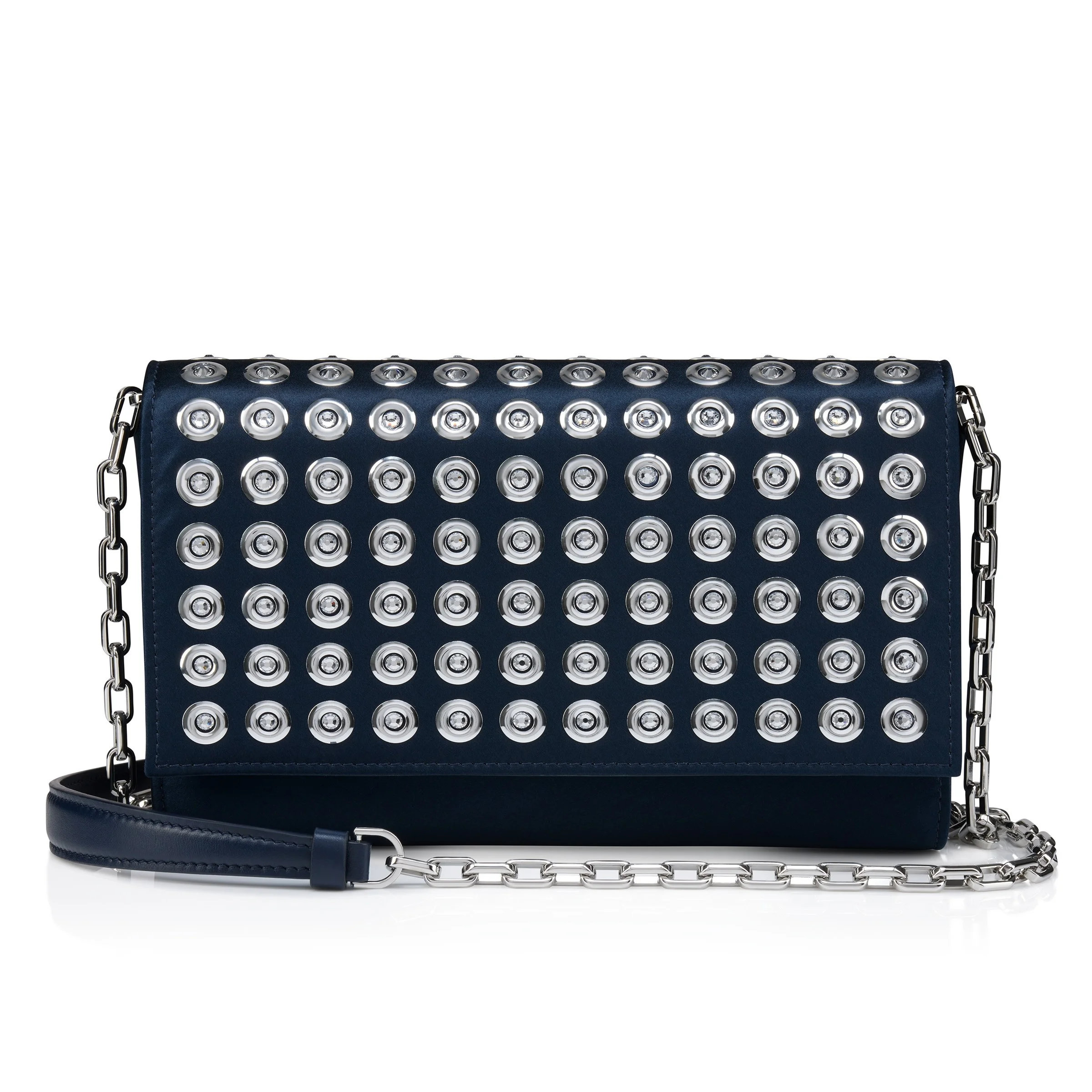 An iconic Maison Christian Louboutin model, the Paloma clutch boasts sophistication. It has slender lines and is crafted from Zaffiro navy crepe satin. This model is trimmed with rhinestones circled by metal eyelets that enhance the bag's shape. - Dimensions: H 14.5 x L 23 x W 6 cm - A 124 cm detachable chain strap reinforced with leather, so it can be hand-held or worn over the shoulder - Magnetic fastener - 3 inside pockets - 10 card slots Product information Reference: 32550604319 Color: Zaffiro Material: Crepe satin Dimensions: 145mm x 230mm x 60mm