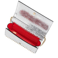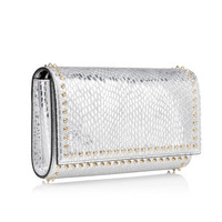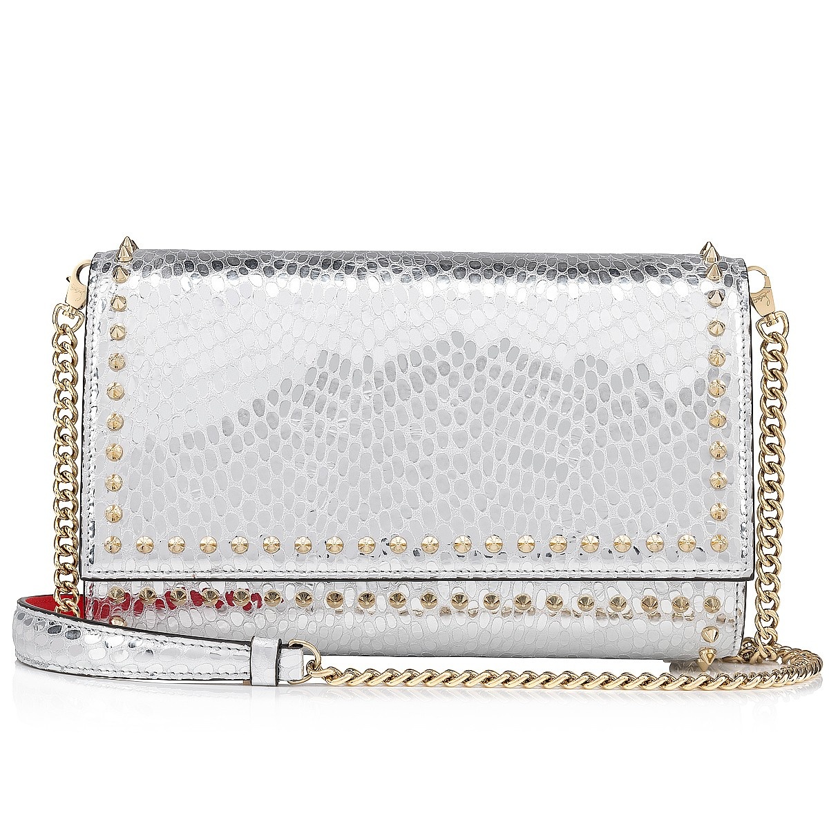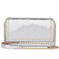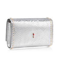 An iconic Maison Christian Louboutin model, the Paloma clutch boasts smart, sophisticated style. This elongated model is entirely crafted in silver Igualam, a reptile-effect embossed laminated leather. It is outlined with signature spikes. - A 124 cm/49 inch detachable leather-reinforced chain strap allows it to be carried by hand or over the shoulder - Magnetic fastening - 3 inside pockets - 10 credit card slots - Dimensions: H 14.5 x L 23 x W 6 cm/H 5.5 x L 9 x W 2.4 inches Product information Material: Creative leather Color: Silver Reference: 1245178M658 Dimensions: 5.7 x 9.1 x 2.4 inches Collection: Summer 24