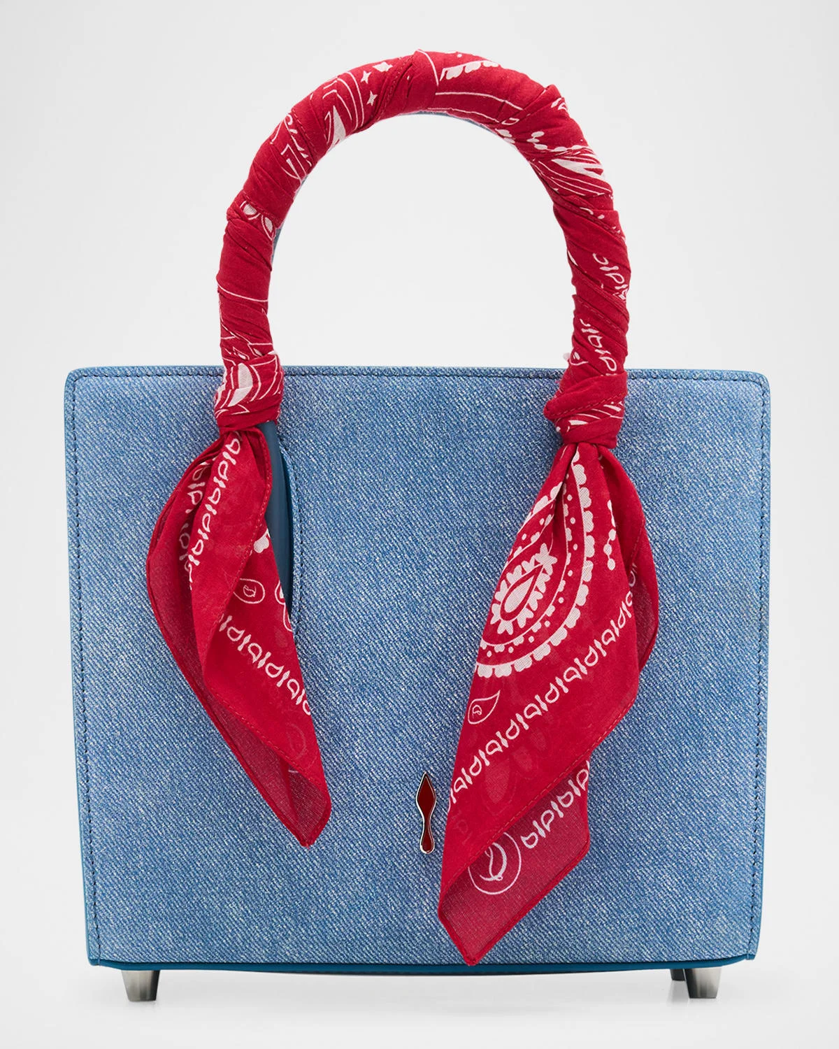 This "Paloma" tophandle bag from the Christian Louboutin Texas Meets Paris Collection is crafted in cotton denim and smooth leather. A bandana scarf in signature red wraps around one handle for a bright accent. Rolled top handles Detachable, adjustable shoulder strap Can be worn as a top handle or shoulder bag Zip top closure Signature red interior Feet protect the bottom of the bag Approx. 7.1"H x 8.5"W x 3.5"D Made in Italy