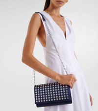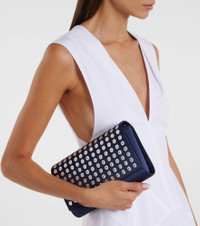 Christian Louboutin's Paloma clutch is the epitome of sophistication. Made from satin crepe, the style is decorated with rhinestones encircled by metal eyelets and features a signature red interior and detachable straps. Product Details - Material: satin, crystals - Lining: leather - Made in Italy - Designer color name: Zaffiro/Silver - Item color: blue - Hardware color: silver - Internal details: Card slots, internal slot pocket, internal zipped pocket - Closure: magnetic fastening - Detachable chain and leather shoulder strap - Includes: dust bag, box - Item number: P01039035 Size & Fit - Height 14cm-5.5" - Width 23cm-9" - Depth 4.5cm-2" - Chain length 114cm-45"