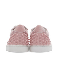 Low-top calfskin suede sneakers in pink. Signature stud detailing throughout. · Lace-up closure · Padded tongue and collar · Eyelets at inner side · Buffed leather lining · Tonal textured rubber midsole · Signature red rubber outsole · Pink hardware Supplier color: Rosy/Rosy Mat Upper: calfskin. Sole: rubber.