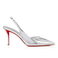 The Posticha slingback is sculpted into an elegant shape and features a transparent PVC insert to reveal a glimpse of the toe. Set on a 80 mm stiletto heel that offers a flash of the Loubi red sole, this specchio metallic-finish model in silver is a timeless slingback with a sophisticated finish that embodies Maison Christian Louboutin style. Product information Reference: 3240221S211 Color: Silver Material: Specchio leather Heel Height: 80 mm Collection: Fall Winter 24