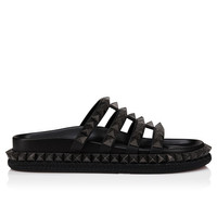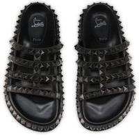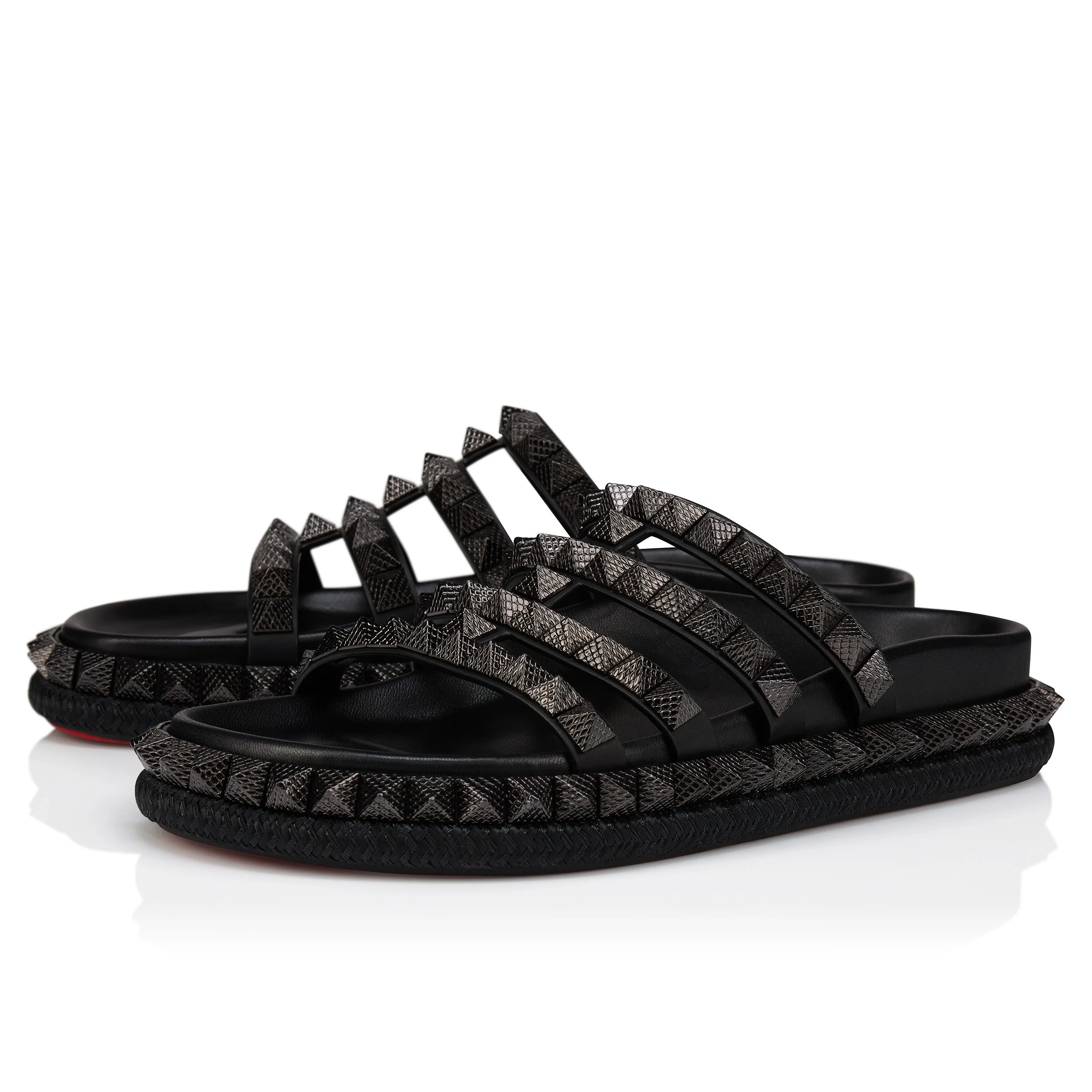 Inspired by the ancient heritage of Alula in Saudi Arabia, the Pyra Hallulila is crafted in waxed black calf leather. This mule sandal sits on a sole crafted from rope. Tiny pyramid-shaped spikes adorn this slip-on mule that's finished with the signature Maison Christian Louboutin Loubi red sole. Product information Reference: 3250245B439 Color: Black Material: Waxed calf leather