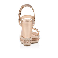 The Pyraclou sandal is a twist on the traditional espadrille with an audacious appeal. Inspired by Egyptian architecture, this Maison Christian Louboutin model is crafted in iridescent Leche beige calf leather with pink highlights and sits on a 110 mm heel. The straps and rope platform sole are adorned with signature tonal spikes. Product information Material: Leather Color: Beige Reference: 1240071F608 Heel height: 110 mm Collection: Summer 24