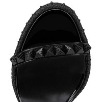 Maison Christian Louboutin's Pyraclou is a wedge sandal that stands out from the crowd. It has two slender straps adorned with glossy pyramid-shaped signature spikes. The bottom of the 110 mm wedge is also adorned with a row of spikes and these are outlined with a decorative rope. This model showcases black patent leather and is finished with tonal lining. Product information Material: Patent leather Color: Black Reference: 3210806B439 Heel height: 110 mm Collection: Fall Winter 23