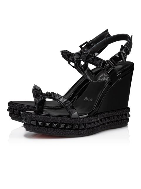 Maison Christian Louboutin's Pyraclou is a wedge sandal that stands out from the crowd. It has two slender straps adorned with glossy pyramid-shaped signature spikes. The bottom of the 110 mm wedge is also adorned with a row of spikes and these are outlined with a decorative rope. This model showcases patent leather in neutral Leche with tonal spikes. Product information Material: Patent calf leather Color: Leche Reference: 3210806F608 Heel height: 110 mm Collection: Fall Winter 23
