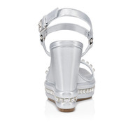 The Pyrastrass sandal is a twist on the traditional espadrille with an audacious appeal. Inspired by Egyptian architecture, this Maison Christian Louboutin model is crafted in silver laminated leather and sits on a 110 mm heel. The straps and rope platform sole are adorned with signature spikes. Product information Material: Nappa leather Color: Silver Reference: 1240856S211 Heel height: 110 mm Collection: Summer 24