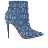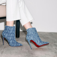 The elegant So Kate Booty boasts urban lines. Set on a 100 mm stiletto heel and featuring a side zip, it is crafted in denim-blue fabric and adorned with the CL monogram. This Maison Christian Louboutin model features a pointed toe and a tapered silhouette. Product information Reference: 3240553BL72 Color: Denim Material: Cotton Heel Height: 100 mm Collection: Fall Winter 24