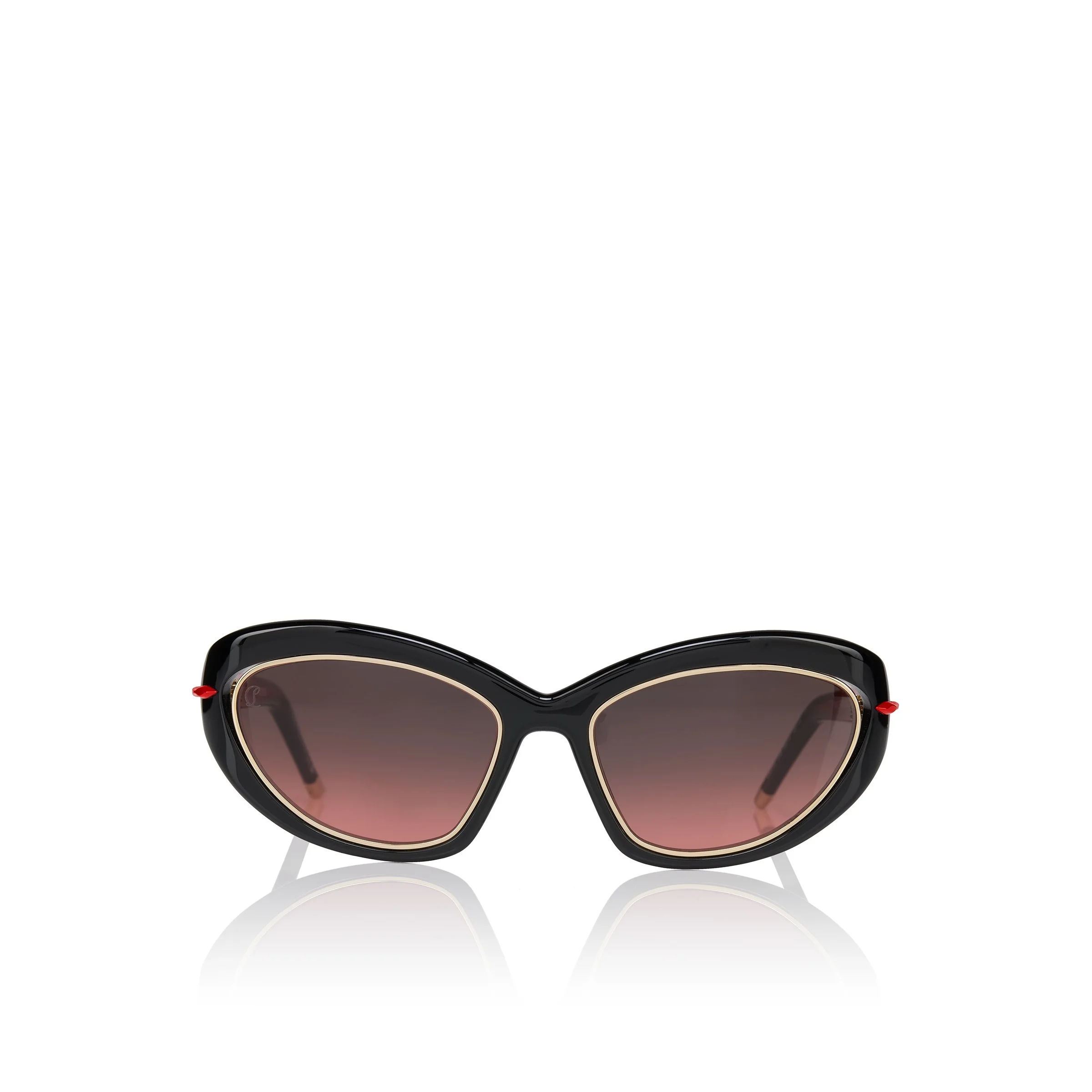 So Kate LB0003 is one of the most iconic styles of this sunglasses collection. The frontal profile is inspired by the shape of the red sole. Metal eye rim profile enrich the acetate of the frontal and crafted metal with palmette pattern is a detail that embellish the temples. This model is made in a bilayer black top color, transparent red base and gradient red lenses. High-performance Zeiss lenses offering exceptional quality comfort and durability in an exclusive color made only for Christian Louboutin collection. Designed to make a lasting impression. The meticulously crafted curves of the frame front are reminiscent of the architectural splendor of iconic landmarks, making these glasses not just an accessory, but a statement piece. This Art Deco-inspired frame is perfect for those who appreciate the finer things in life and aren't afraid to make a statement, a perfect blend of classic sophistication and contemporary style. Made in Italy. Product information Reference: 1255337K197 Color: Black Smoke Material: Acetate Lens width: 55 mm Bridge length: 18 mm Temple length: 135 mm Category of filtration: 2