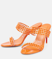 Tough-luxe, brand-signature Lou spikes lend an exquisite edge to the Mytheresa-exclusive Spike Only sandals from Christian Louboutin. They’re made from sunburst orange patent leather with PVC straps, 85mm heels, and iconic red-lacquered soles. Product Details - Toe shape: round open toe - Upper: fabric - Comes with extra heel tips - Sole: leather insole, signature red leather sole - Comes with a box - Designer color name: Papaya - Comes with dust bags - Lining: fabric - Made in Italy - Item number: P00691725 Size & Fit - True to size - Wide - European sizes - 8,5cm-3.5" heel (size EU 38)