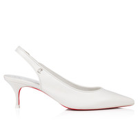 The Sporty Kate Sling pump crafted from nappa leather in Bianco white and featuring a delicate 55 mm kitten heel is the embodiment of elegance. The closed toe contrasts with the open slingback and fine stitching adorns each edge. Detailed with the iconic Maison Christian Louboutin initials and embellished with a daring Loubi red sole, this slingback makes a statement. Product information Material: Nappa leather Color: Bianco Reference: 3240004W302 Heel height: 55 mm Collection: Fall Winter 24