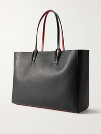 Christian Louboutin's 'Cabata' tote is decorated with silver-tone studs along the loops that support the handles - the detail is subtle yet impactful. It's made from textured-leather in an otherwise minimal design and comes with an attached zipped pouch. There's enough room within the red interior to fit your wallet, cosmetics pouch and a book. Details & Care - Black textured-leather (Calf) - Top handles - Internal detachable zipped pouch - Smooth leather lining - Clasp fastening at open top