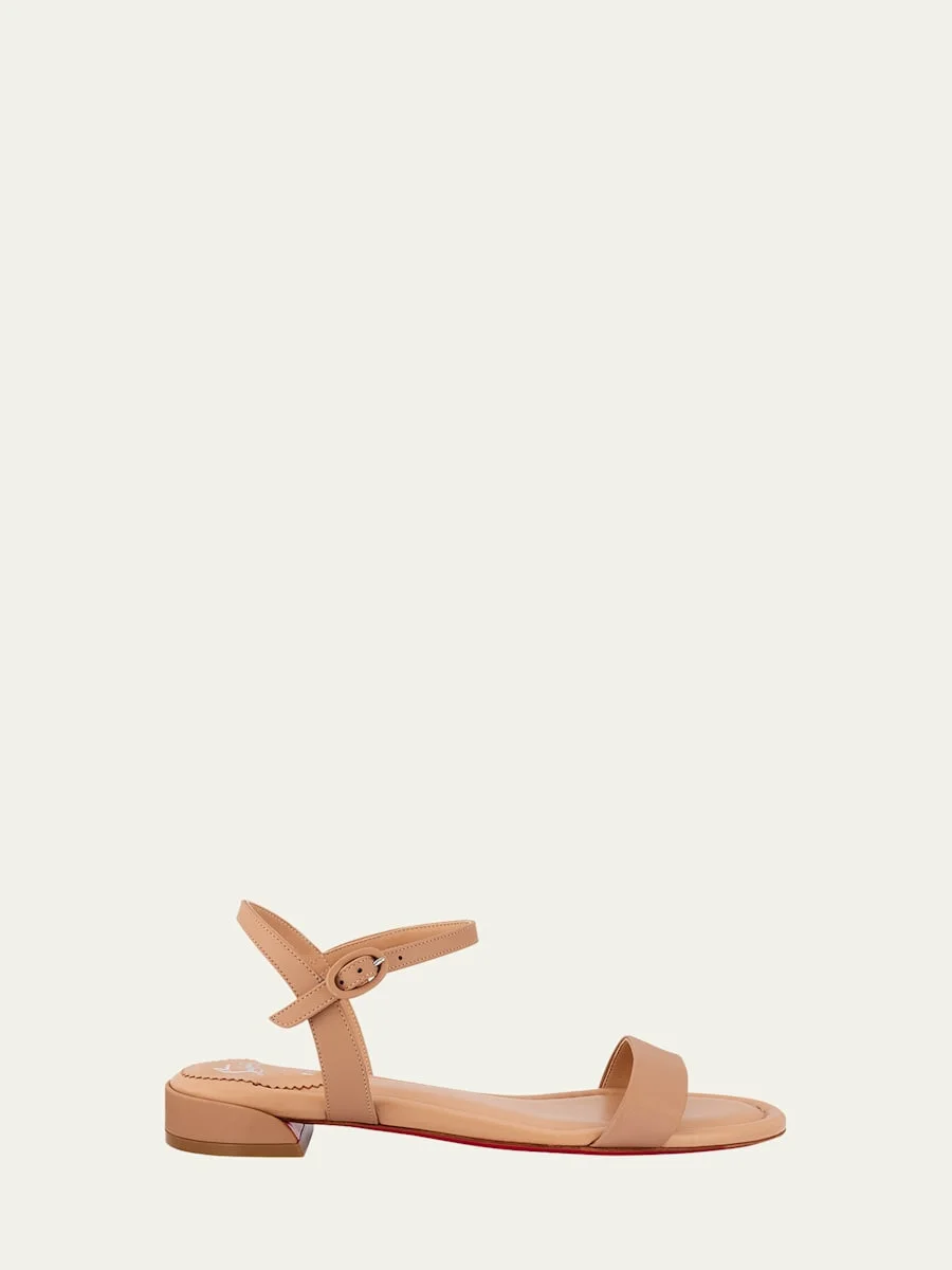 Christian Louboutin leather sandals Flat heel Open toe Adjustable ankle strap Signature red leather outsole Made in Italy