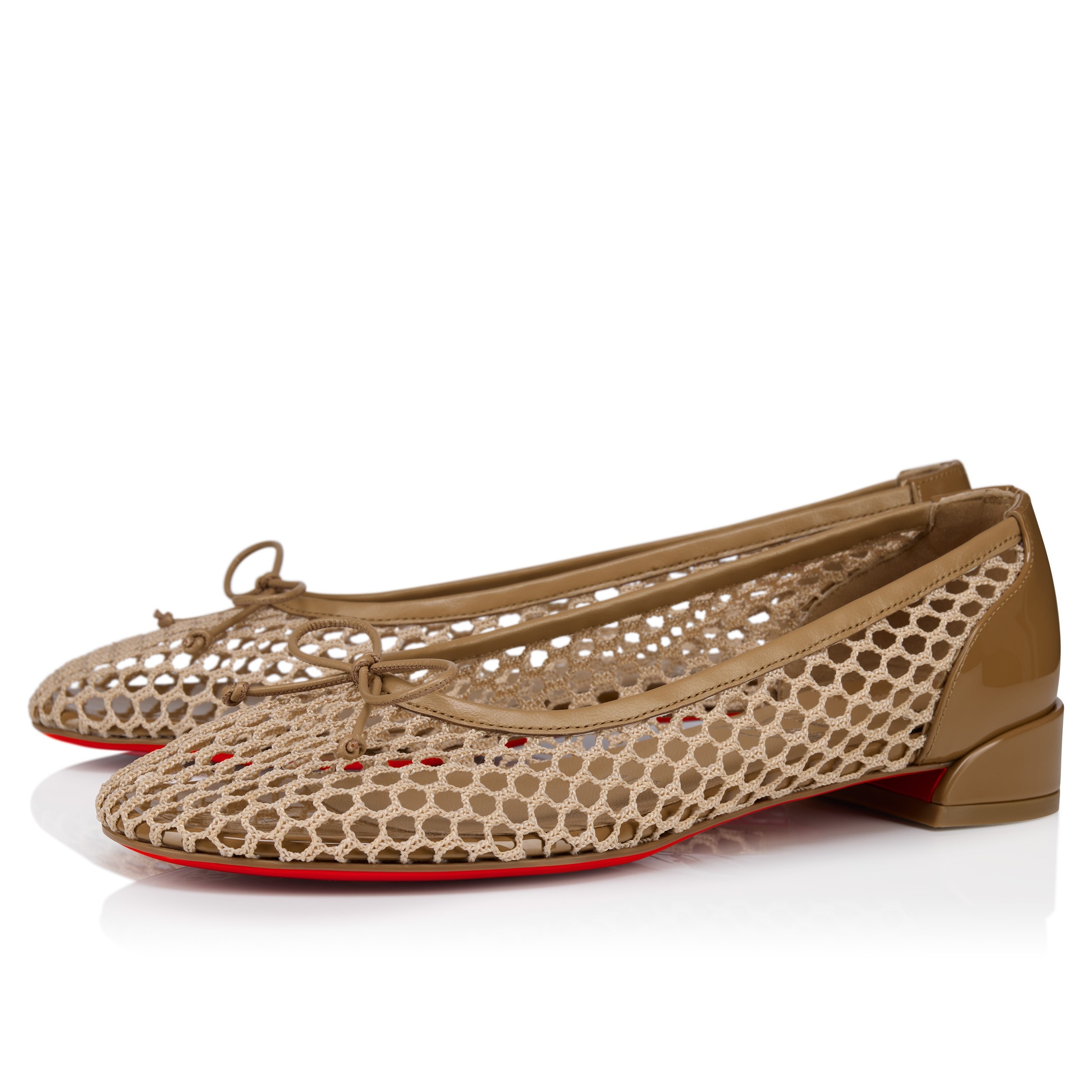 The Sweetie Jane Mesh ballerina pump has a sophisticated appeal. It features a slightly rounded toe and is entirely crafted in Lionne brown fishnet and patent calf leather. This elegant Maison Christian Louboutin style features a small bow on the top and a tapered silhouette. Product information Reference: 1250987F760 Color: Lionne Material: Mesh and patent leather