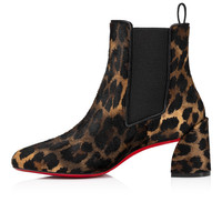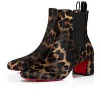 An ankle boot with a sophisticated silhouette, the Turelastic features a chunky 55 mm angled heel. Showcasing clean lines that epitomize Maison Christian Louboutin's elegance, it is crafted in smooth brown leather with a Pony Kitty leopard print. It has a curved toe and features an elastic insert on the side, enhanced with an embossed CL varsity logo. Product information Material: Calf leather Color: Brown Reference: 3230761BW6D Heel height: 55 mm Collection: Fall Winter 23