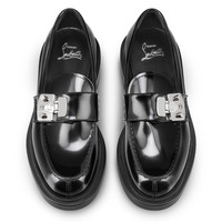 The Urban Lock Moc is adorned with a strap embellished with a signature monogrammed clasp lock, alluding to the designer's Egyptian inspiration. This urban-style model by Christian Louboutin revisits the Penny Loafer. It features refined, elegant lines in black abrasivato leather. Product information Reference: 1250276BK01 Color: Black Material: Calf leather