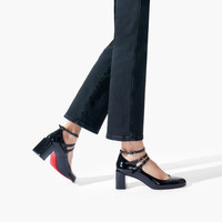 The slender and elegant silhouette of the Vernica shoe shows off the foot with a deep cut upper, adorned with three thin choker-style straps that highlight the instep and ankle. It is mounted on a 55 mm square heel and crafted in black patent calfskin highlighted by discreet stitching. Its rounded toe and urban design express the iconic sophistication of the Maison.