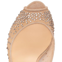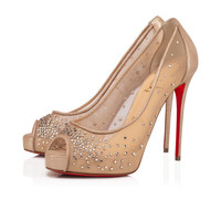 The Very Strass pump with its bold arch is dressed in transparent nude mesh with strass that enhances the shine of its heel and its lamé suede counter. It is set on a 120 mm heel and its clean-lined upper features an open toe and the Maison Christian Louboutin signature low cut. This timeless shoe is highlighted with discreet finishes.