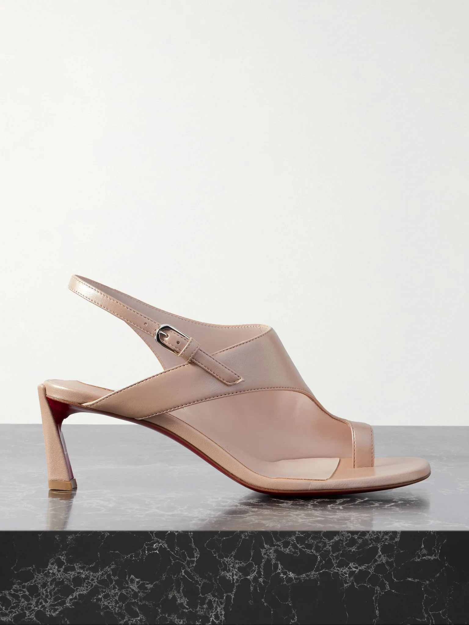 Christian Louboutin's 'Viva Condora' sandals have striking 55mm angular heels lacquered in the brand's iconic red. They've been crafted in Italy from smooth leather and have wide, asymmetric straps that enhance their graphic lines. The versatile beige shade means you can wear them with almost anything. Size & Fit - Fits true to size, take your normal size - Italian sizing Details & Care - Heel measures approximately 55mm/ 2 inches - Beige leather (Lamb) - Buckle-fastening slingback strap