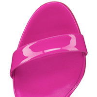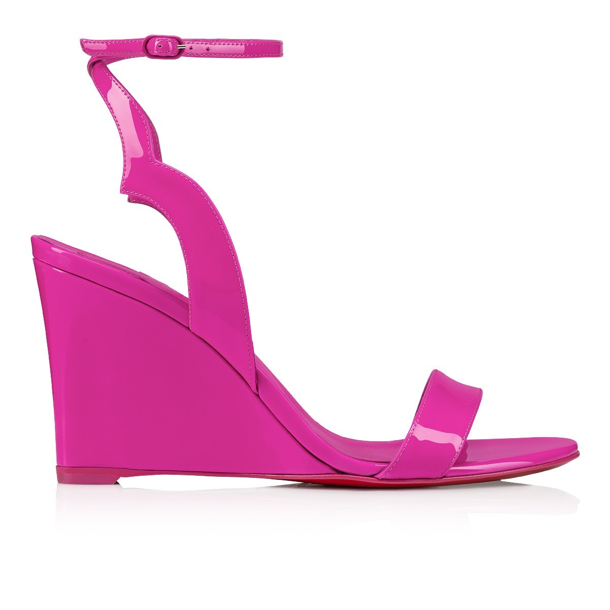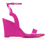 Taking its cues from the iconic Hot Chick Pump, the Zeppa Chick stands out with graphic lines. This Maison Christian Louboutin model features an 85 mm wedge heel, an ankle strap and V-shaped notches cut out of the side. It is crafted in Bolerose pink patent leather with a low-cut vamp for an elegant finish. Product information Material: Patent leather Color: Pink Reference: 3230041P836 Heel height: 85 mm Collection: Fall Winter 23