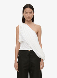 The Aiba Draped Jersey Tee crafted in fluid slinky jersey and defined by voluminous draping across the body. Sculpted at the shoulder with gathered pleats, the silhouette falls into a soft sleeve wrap that contrasts the fitted base. Style with tonal tailoring or wide-leg denim for off-duty dressing. - Asymmetric, one-shoulder silhouette - Sculptural pleating through the shoulder - Voluminous wrap sleeve detail - Main: 100% Viscose - Dry Clean Only Model is 180cm/5'11" and wears size AU 8 (US 4) AU sizing