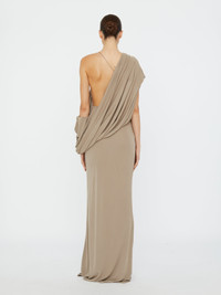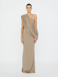 The Aiba Draped Jersey Tee Dress is cut in a fluid viscose jersey and defined by a sculptural, one-shoulder silhouette. A clean column base is contrasted by a softly gathered overlay that drapes diagonally across the body, creating organic volume through the neckline and hip. The asymmetric construction is secured with a fine shoulder strap and left unstructured at the hem. - One-shoulder silhouette with asymmetric draped overlay - Lightweight viscose jersey with fluid movement - Full-length column base for a refined profile - Fine internal shoulder strap for support - Soft gathering through neckline and hip - Main: 100% Viscose - Dry Clean Only Model is 180cm/5'11" and wears size AU 8 (US 4) AU sizing