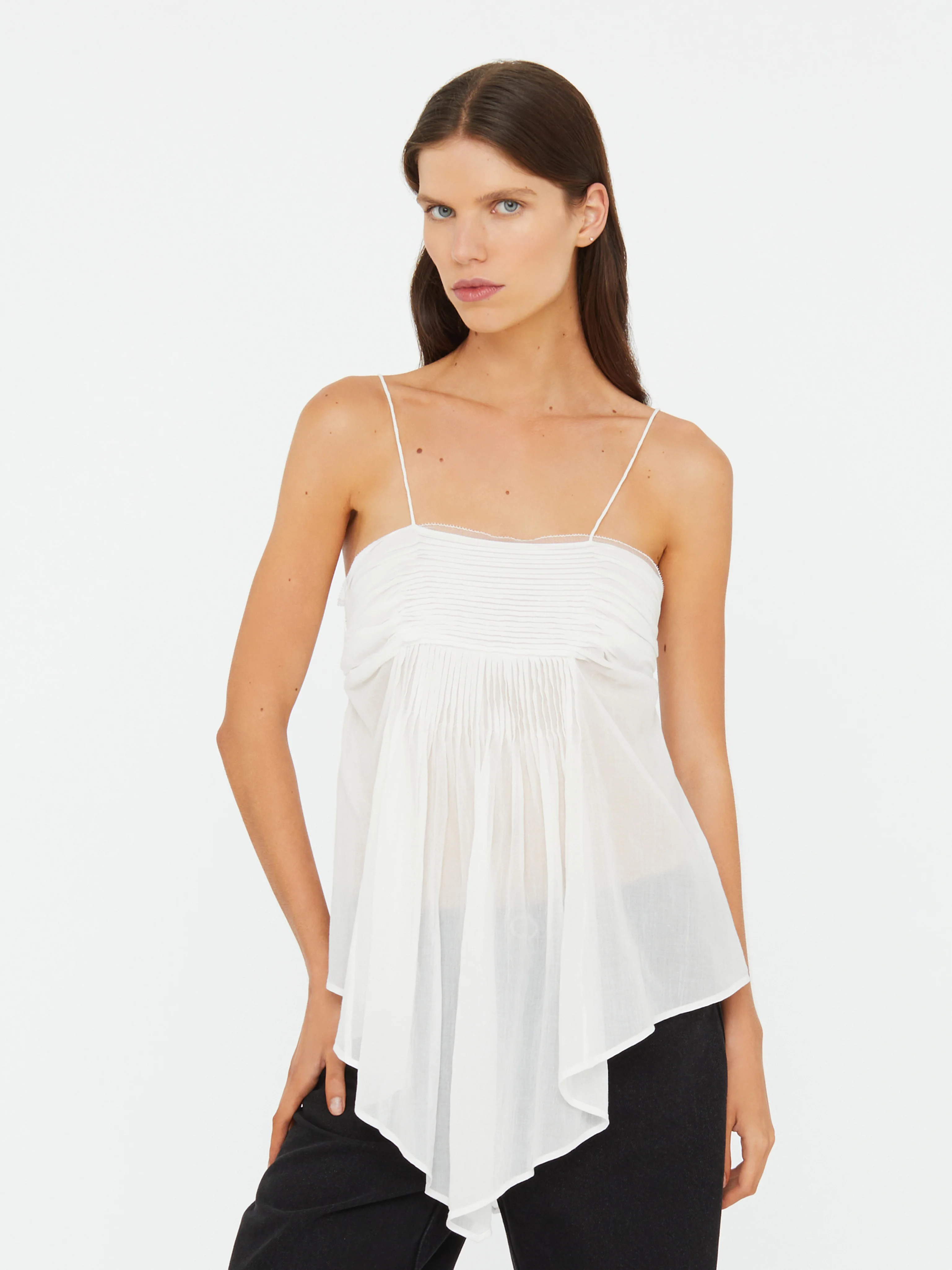 Lightweight and fluid, the Anemoi Cami is designed with fine straps and a softly ruched bodice. Gathered pleats define the bust, while an asymmetric hem falls in handkerchief layers. Crafted in a cotton-viscose voile, offering soft structure and natural drape. Pair back with wide-leg trousers or deconstructed denim for a refined approach to off-duty dressing. - Voile construction - Ruched detailing through the bust - Handkerchief asymmetric hemline - Relaxed fit - Main: 55% Cotton 45% Viscose - Dry Clean Only Model is 180cm/5'11" and wears size AU 8 (US 4) AU sizing