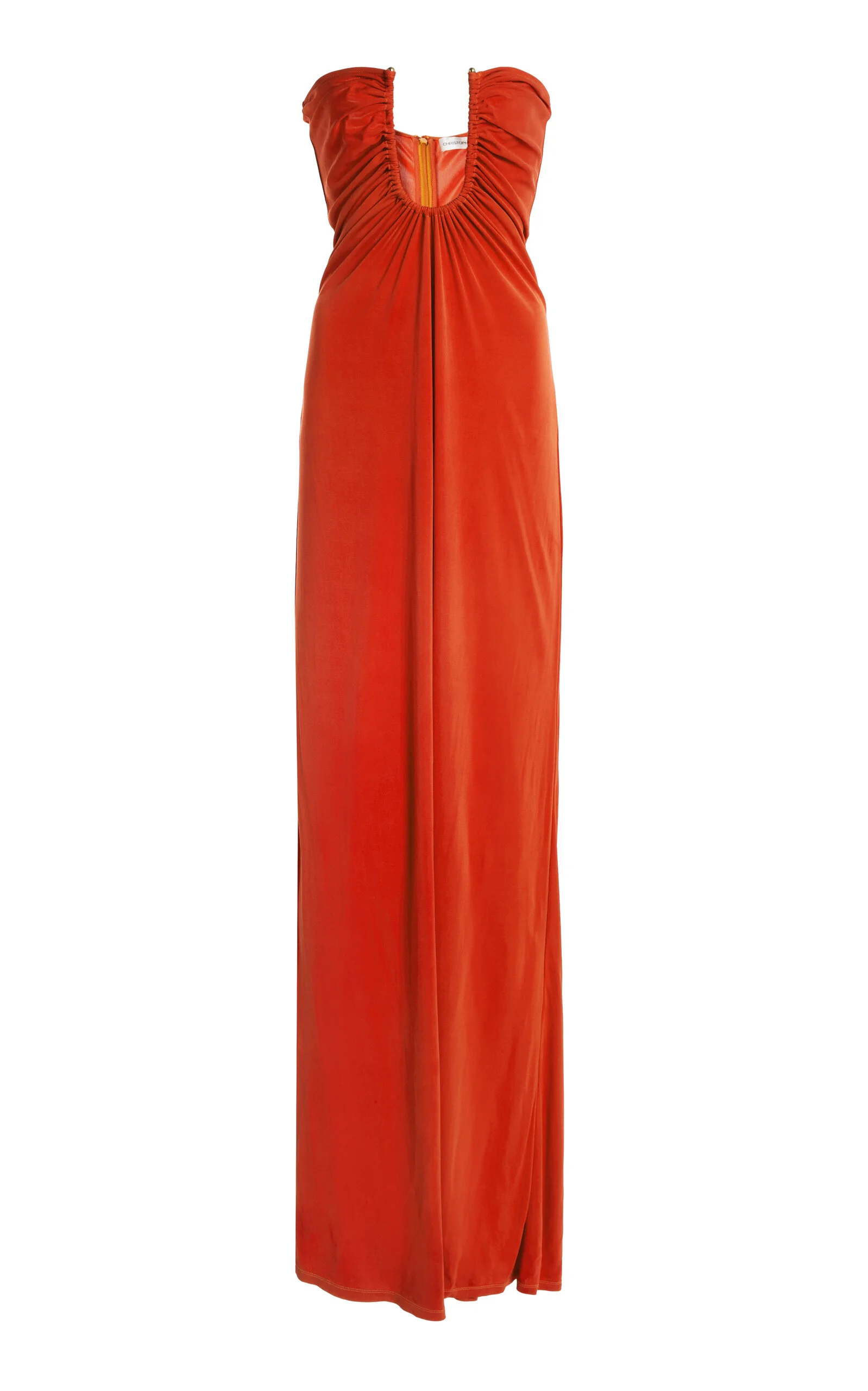 The designer continues to build on his cult-worthy, undone and slinky sex appeal—channeling as always the relaxed sensuality of his native Australia. The ‘Arced Palm’ dress is a signature formal style by the label bearing curved hardware that exposes the waist. This version is cut from fluid jersey in a vibrant hue, perfect for summer occasions. PRODUCT DETAILS - Resort ‘26 - Concealed zip fastening - Composition: 100% viscose; Trim: 100% zinc alloy - Dry clean - Designer color: Tangerine - Imported