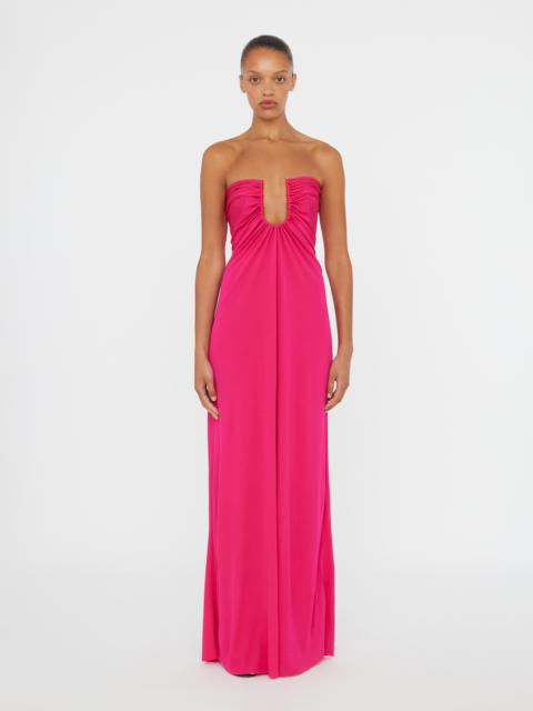 An evolution of the brand’s sculptural evening codes, the Arced Palm Strapless Dress is defined by a plunging neckline anchored by curved hardware that draws the eye to the centre front. Cut from fine stretch jersey, the silhouette is ruched through the bodice to contour the waist before falling into a clean, floor-length column. - Style with minimal heels and subtle jewellery for an understated evening statement. - Plunging arced neckline with signature hardware - Strapless bodice with gathered ruching - Contoured waist shaping - Full-length column silhouette - Soft, fluid jersey with stretch - True to size - Main: 95% Viscose, 5% Elastane Model is 180cm/5'11" and wears size AU 8 (US 4) AU sizing