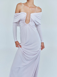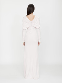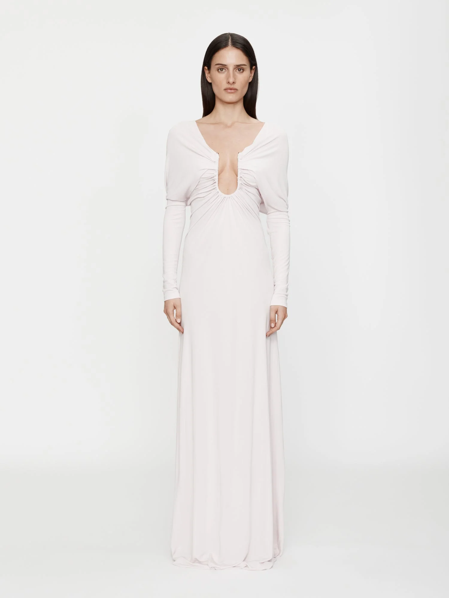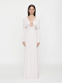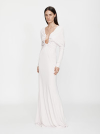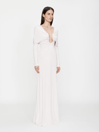Evolved from the brands signature arced palm silhouette, sculptural hardware anchors a plunging neckline in this shawl gown. Crafted in fine interlock jersey that ruches and defines the waist. - Signature u prong hardware - Plunging neckline - Gathered ruche detailing - Slim fit at bust with internal tape - Maxi silhouette - Invisible back zipper - Slim fit bodice - True to size - 100% Viscose - Hardware: 100% Zinc Alloy Amelie is 180cm/5'11” and wears size AU 8 (US 4) AU sizing