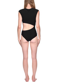 Christopher Esber one piece swimsuit in black, V-neck collar, cap sleeves, asymmetric cutout design. Made in Australia. Australian Sizing. Composition: 72% Polyamide, 28% Elastane. Model is 5ft 8” and is wearing a size 8. Bust: 33” Waist: 24” Hip: 34"