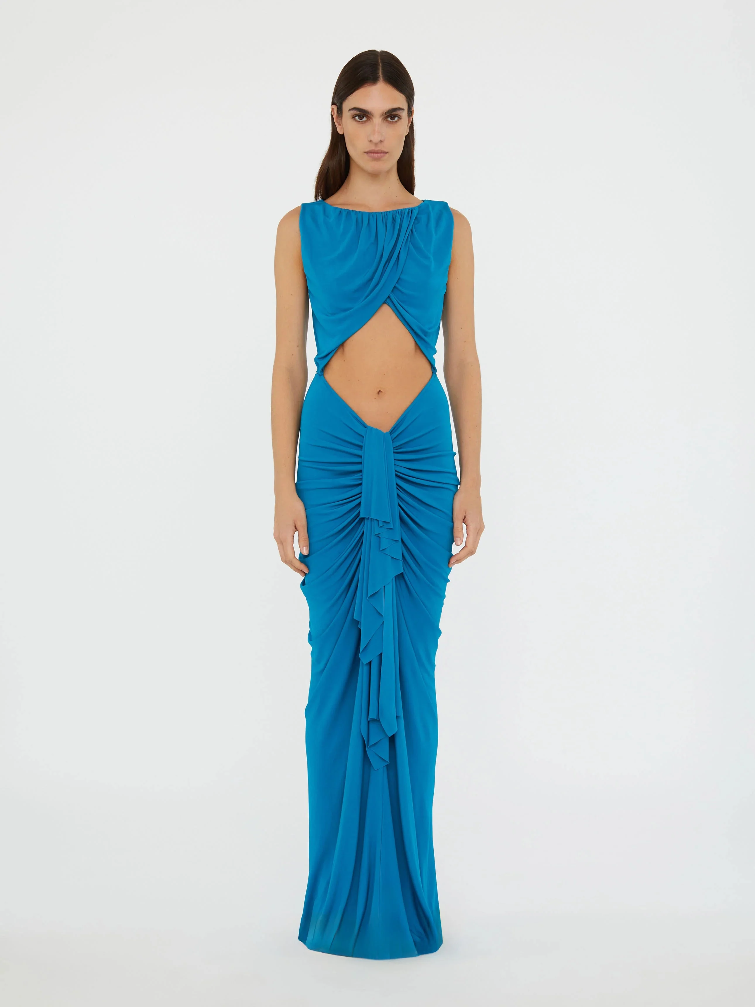 An exploration of fluidity and form, this sleeveless draped jersey maxi gown is artfully constructed with an exposed midriff and cascading draped panel. Refined by a ruched bateau neckline and signature cut-out accents. - Cascading front draping - Exposed midriff - Ruched bateau neckline - Slim column fit - Invisible back zip - True to size - Luxe dry jersey fabrication - Main: 100% Viscose - Dry Clean Only - Low iron, Low steam Model is 180cm/5'11" and wears size AU 8 (US 4) AU sizing