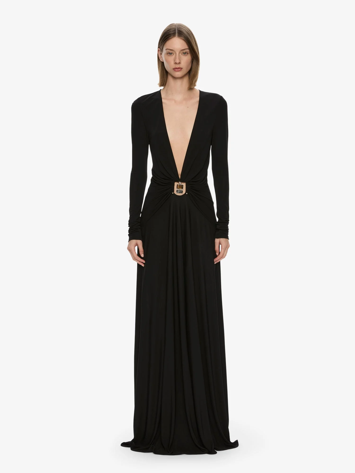 Cut in fluid dry jersey, the Bezel Quartz Ruched Long Sleeve Dress is defined by a deep plunging neckline and precise gathering drawn into a central quartz bezel at the waist. The hardware anchors the silhouette, shaping the torso before the fabric falls cleanly into a full-length column. Style with minimal heels for evening focus, or layer under sharp tailoring for modern contrast. Deep plunging V neckline Long fitted sleeves Central quartz bezel hardware at waist Ruched waist detailing Floor-length column silhouette in stretch jersey Main: 100% Viscose Contrast: 72% Polyamide 28% Elastane Hardware: 100% Zinc Alloy Model is 180cm/5'11" and wears size AU 8 (US 4) AU sizing