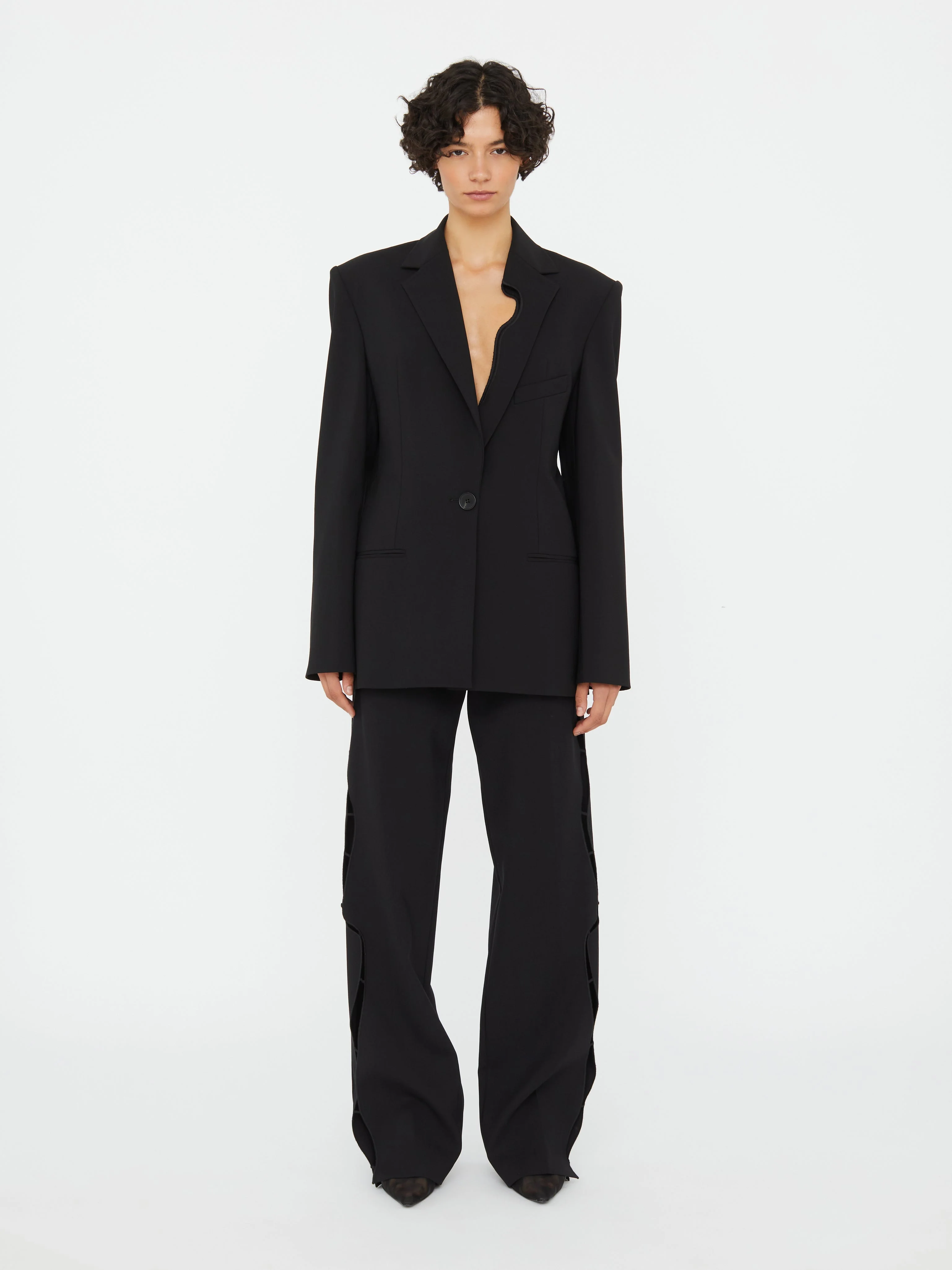 A classic tailored blazer disrupted by an organic cut-out detail along the lapel. Structured shoulders and a single-breasted front bring precision, while the asymmetric line introduces a subtle subversion - clean, architectural, and distinctly Esber. Style with the matching trouser or layered over skin for sculptural minimalism. - Tailored single-breasted blazer - Sculptural curved lapel detail - Structured shoulders with light padding - Single-button front closure - Welt pockets at waist and chest - Darted seams for a cinched silhouette - Fully lined - Main: 96% Wool, 4% Elastane - Lining: 100% Viscose - Dry Clean Only Model is 180cm/5'11" and wears size AU 8 (US 4) AU sizing