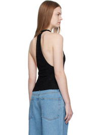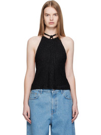 Viscose-blend mesh top. · Metallic thread detailing throughout · Self-tie halter neck · Racer back · Full stretch jersey lining Supplier color: Black metallic Body: 64% viscose, 20% polyamide, 16% polyester. Lining: 64% nylon, 36% elastane. Made in Viet Nam 252311F111003
