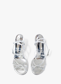 Set atop a 70mm flared heel, these metallic sandals are crafted in Italy from Lamb Leather. With fine buckle detailing & intricate multi straps finished by hand. - Crafted in Italy - Round toe Hand woven - Leather straps at vamp & toe cap - Stylised stiletto heel - Rubber injection at base of heel - Heel Height: 70mm - Upper: 100% Lamb Leather Nappa - Sole: 100% Cow Leather Footwear is in IT sizing