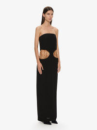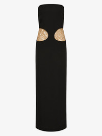 Defined by curved, sequin-embroidered inserts at the hip, cut to contour and catch the light. This column silhouette falls cleanly to the floor with a single back split for ease of movement. - Strapless full-length gown - Contoured hip panels adorned with tonal sequin embroidery - Sculpted silhouette with clean column shape - Centre back split - Close fitting design - Main: 100% Viscose - Contrast: 100% Polyester Model is 180cm/5'11" and wears size AU 8 (US 4) AU sizing