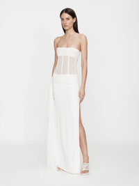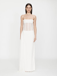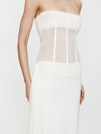 Gathered tulle, double-faced mesh, and heavy faille are layered to sculpt the signature Christopher Esber wedding dress. Inbuilt boning on a corset upper creates structured rigidity to frame the body. Accentuated by a silk tulle gather detail at bust and sheer bodice. - Maxi silhouette - Corseted bodice - Zip Fastening - Bodice: 100% Polyester - Skirt: 92% Viscose 8% Elastane - Contrast : 100% Silk - Dry Clean Only Claire is 179cm/5'10.5" and wears size AU 8 (US 4) AU sizing