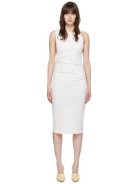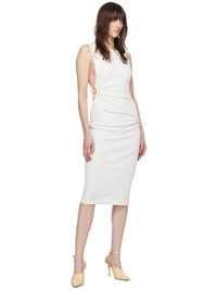 Stretch polyester ribbed jersey dress. Handcrafted sculptural hardware, gathering, and cutouts throughout. · Asymmetric neck · Dropped armscyes Supplier color: White 96% polyester, 4% spandex. Made in Viet Nam 241311F054001