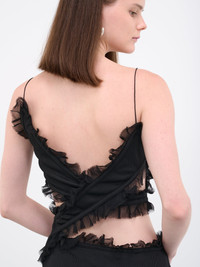 CHRISTOPHER ESBER dress in black, compact rib knit, raw silk georgette, cut-out detail, spaghetti straps, square neckline, criss-cross back, ruffled trim, maxi length, slim fit, true to size. UK Sizing Body - 96% Polyester, 4% Spandex Detailing - 100% Silk Model is 5'10" wearing size 8. Bust: 32" Waist: 24" Hips: 35"