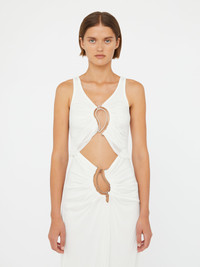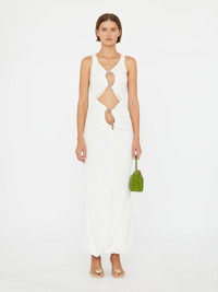 The Paisley Overlay Disconnect Encased Dress crafted in soft jersey and cut to a fluid maxi silhouette. Defined by bubble hem and sculptural cutouts through the torso, each opening is framed by signature metal paisley hardware. Directional ruching enhances movement and defines the form. Style with the Doma Stoned Heel and Turnlock Shoulder Bag for refined occasion dressing. - Fluid maxi silhouette - Soft jersey fabrication - Gathered draping at the hem - Sculptural cutouts through the bodice - Signature metal paisley hardware - Main: 96% Polyester 4% Spandex - Hardware: 100% Copper - Dry Clean Only Model is 180cm/5'11" and wears size AU 8 (US 4) AU sizing