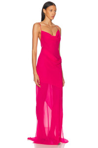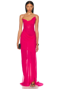 Details - 100% silk - Made in China - Dry clean only - Unlined - Pull-on styling - Cowl-neckline - Sheer chiffon fabric with draped fabric detail at skirt and back slit - Garment is intentionally sheer, undergarments will show through. - Please note undergarment not included - Our Style No. CHRF-WD295 - Manufacturer Style No. 24023198