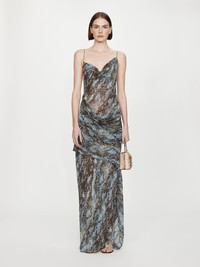 Printed silk drapes fluidly across the body in the Cowl Hip Slip Dress. Designed with a softly folded neckline and asymmetric drape through the hip, the silhouette skims the body with ease and movement. - Printed silk slip gown - Draped cowl neckline and hip detail - Slim, fluid silhouette - Adjustable fine straps - Invisible zip closure at side - Fully lined - 100% Silk Model is 179cm/5’10.5” and wears size AU 8 (US 4) AU sizing