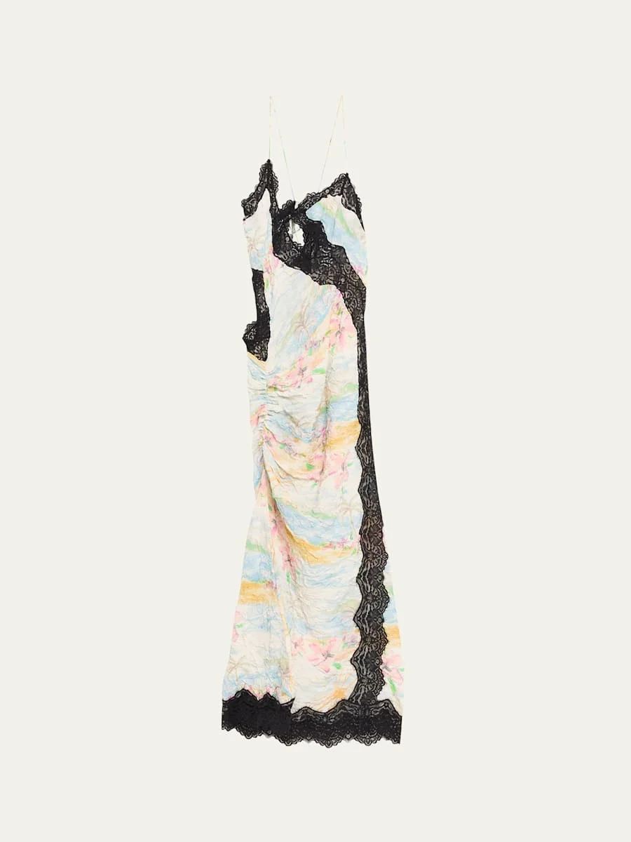 Christopher Esber twisted cami dress in printed crinkle satin with contrast lace trim and a ruched hip detail Scoop neckline; self-tie low back Sleeveless Hem falls below the knee Sheath silhouette Slipover style Viscose/nylon/polyamide/polyester Imported Online Inquiries: BGS21_B9VLH| Store Inquiries: #4983116