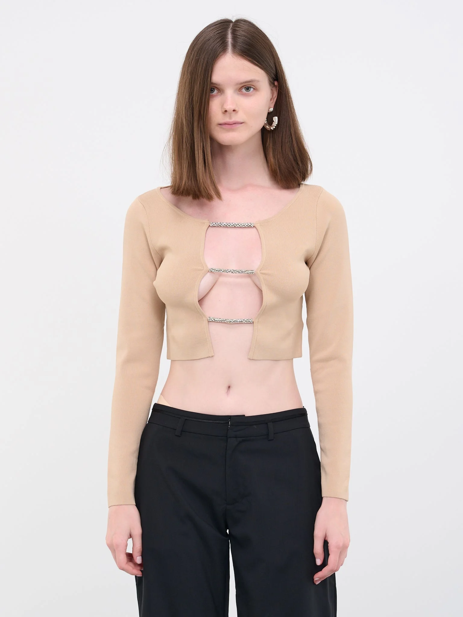 CHRISTOPHER ESBER top in beige, stretch luxe compact rib knit, chest lattice crystal detailing, multi-wear, scoop neckline, long sleeves, mid-weight, cropped, slim fit. Standard Sizing 80% Viscose, 20% Nylon, Crystal Model is 5'10" wearing size XS. Bust: 32" Waist: 24" Hips: 35"