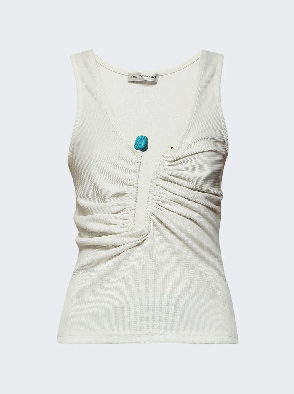 Details - Deep V-neckline with ruched bust - Centre front cut-out detail - Natural stone pendant set in custom copper hardware - Pull-on style - Care according to label - Material: 96% Polyester, 4% Spandex Size Information: Vendor Color Code: Brand Style: 25021568 Designer/Brand: CHRISTOPHER ESBER